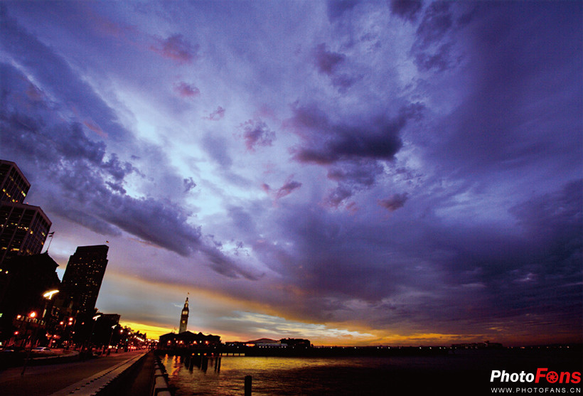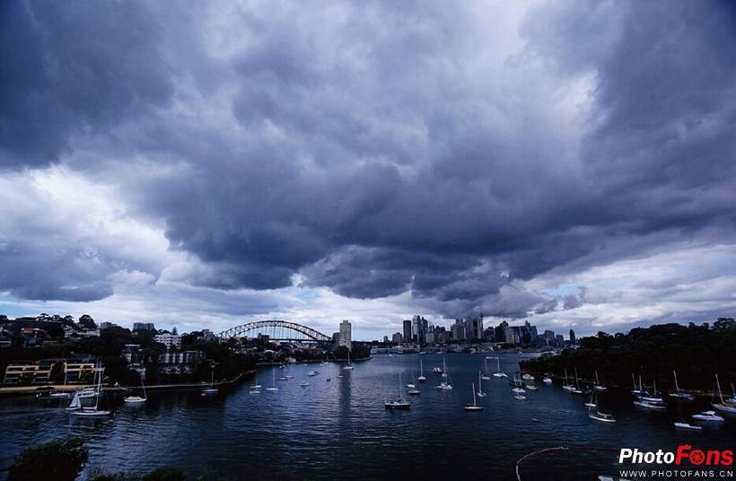 以低水平线构图拍摄乌云密布的天空,大面积厚重的云层给人以很压抑的感觉,加入地面景物可以适当缓解过分沉闷的感觉,并突出了云层气势。