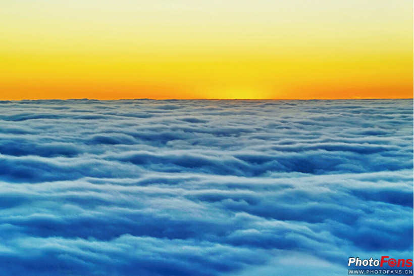 地平线处太阳的光线将部分云海渲染为暖色调,而其他位置的天空及云海则呈冷色,冷暖色调的对比强烈,增加了画面的空间感和透视感,突出了落日主体。