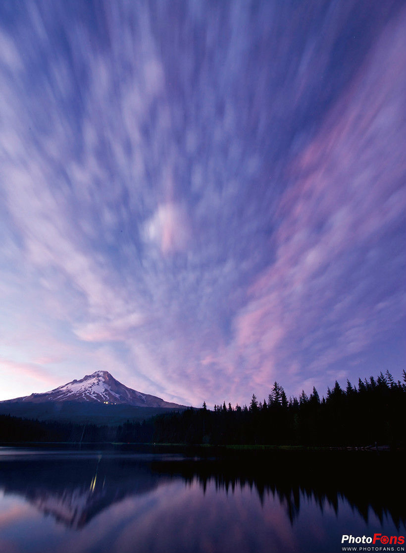 采用广角镜头仰视拍摄云彩,并利用低速快门将正在运动中的云彩在画面中以放射状效果呈现,结合地面山景与水景的对称构图,给画面带来了极强的动感与视觉张力。