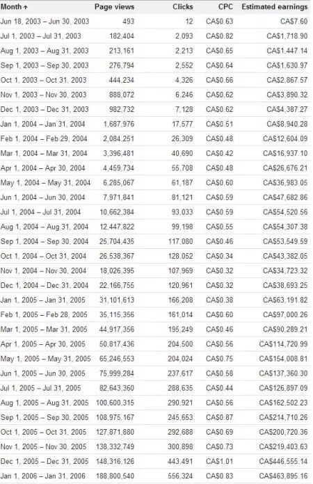 2003年6月,只有493个浏览量,广告收入7.6加拿大元(差不多跟美元等值);2013年7月,就有了18万多的浏览量,广告收入1千7百多了。慢慢每月稳步递增,道理2004年2月,广告收入已经到了1万2千多了。2004年6月的收入,突破了5万块钱。2005年4月,月收入突破10万元。