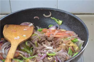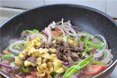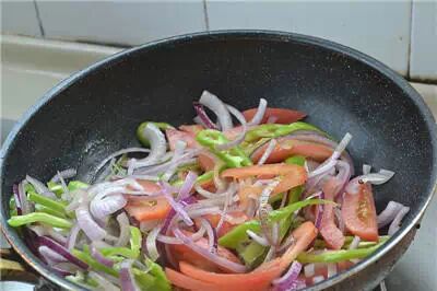 锅中倒入些油烧热,倒入洋葱,番茄,青椒翻炒。18