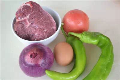 面粉250g,盐3g,水150g,牛肉1块,番茄1个,青椒2个,洋葱1个半,鸡蛋1个,姜末适量。
