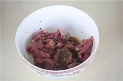 牛肉用半勺盐,一瓶盖酱油,一瓶盖料酒腌制10分钟。15