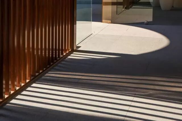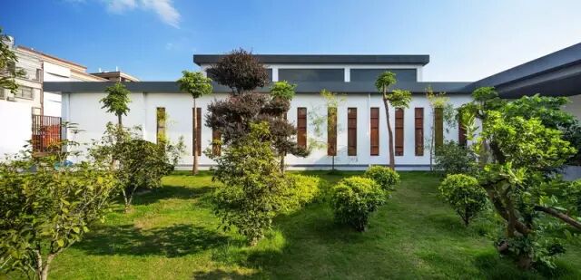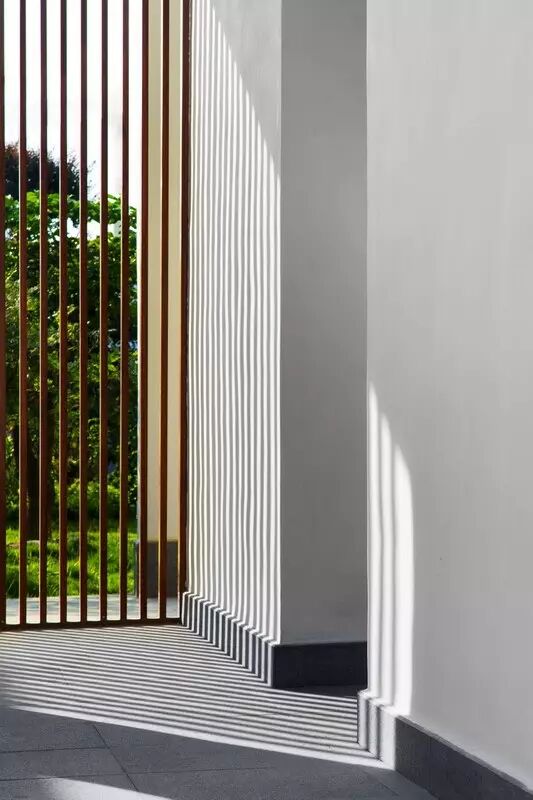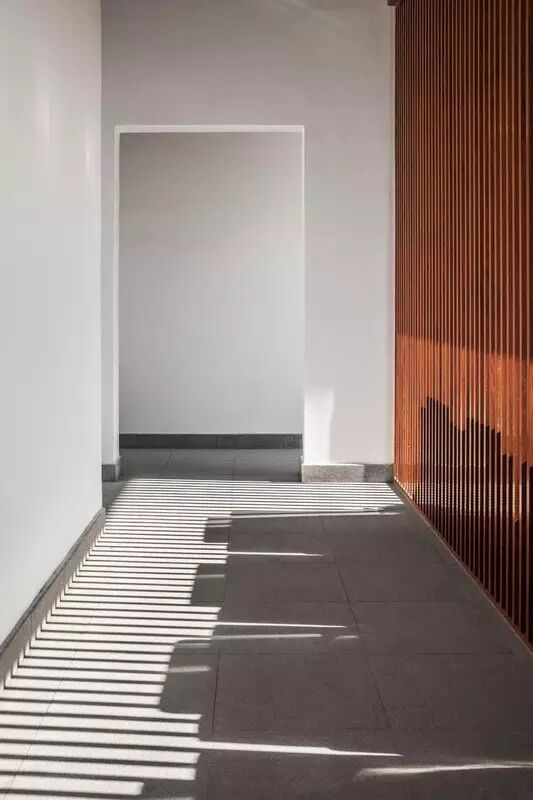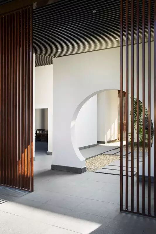 本案使用当地的材料,整体以“白墙灰瓦”的形式呈现,整个空间通透,只采用木格栅和圆形拱门来进行分隔,这样做主要是为了遮挡路人和客人的视线,不致使整个室内空间一览无遗,让整个空间更加有层次感和神秘感,圆形门洞借用后边的景色,整个画面呈现出一幅秀丽画的感觉,设计师通过以宁静的方式来探索文化的力量,建造出属于当地特色的建筑物。