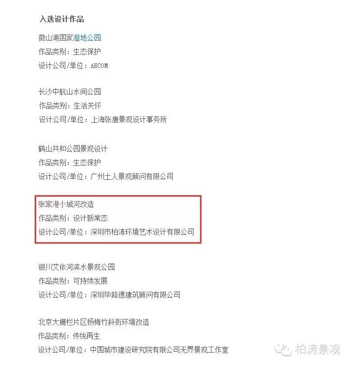 2015年9月23日景观中国网站公布了2015年第二届中国设计大展景观设计组策展人初选设计作品名单,柏涛景观主持设计的张家港小城河改造项目荣誉入选。
