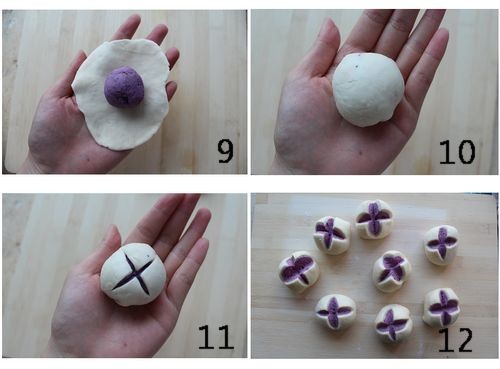 9.取一白面团擀成圆形,放入揉圆的紫薯面团。