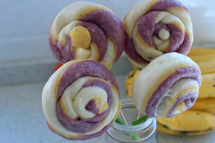 面粉分三份和胡萝卜泥,豆沙,水和成三色面团,醒发半小时,分别擀开成大小差不多的薄饼,叠加在一起,从一边卷起成筒状。切开插入竹棒,醒发一会,入蒸笼蒸熟,就成了棒棒糖状的花卷了。