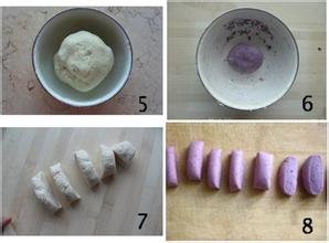 6.取三分之一的白面团加紫薯泥揉成紫薯面团。