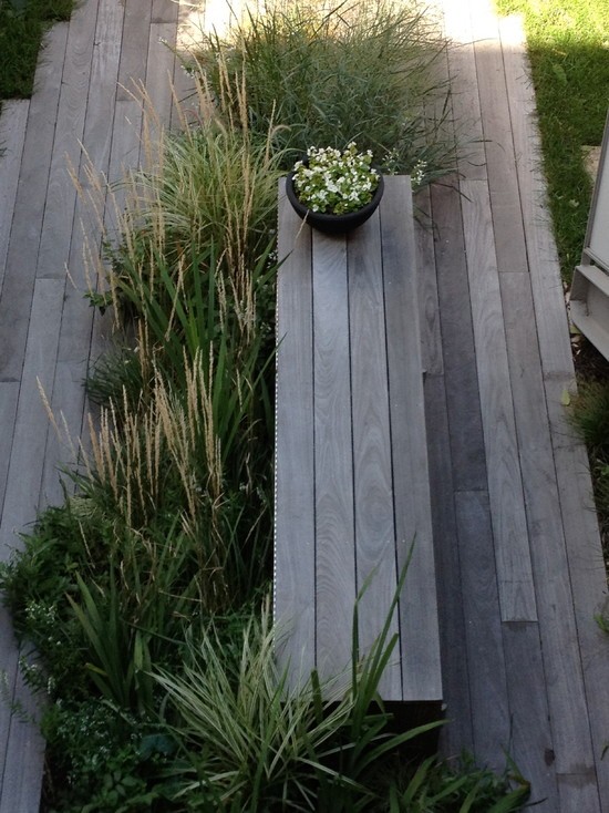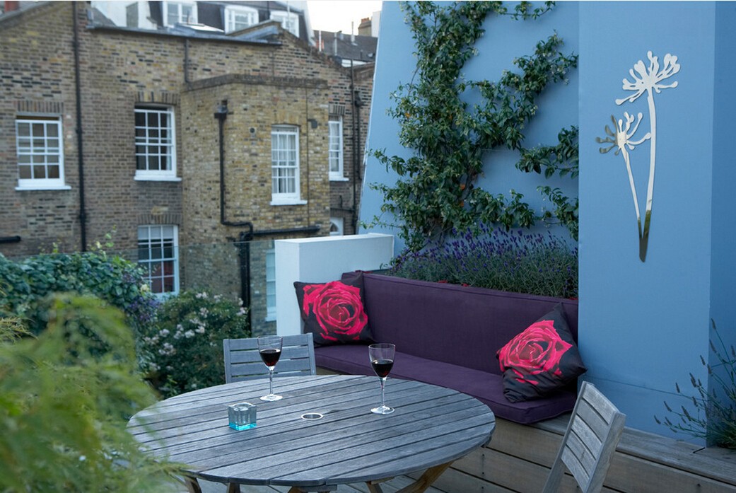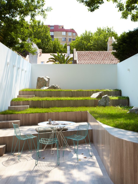 在这个狭窄的院子里,楼梯下郁郁葱葱的草丛,冒出甲板的植物环绕着户外餐桌,这不就是为露天用餐做看精心准备吗?