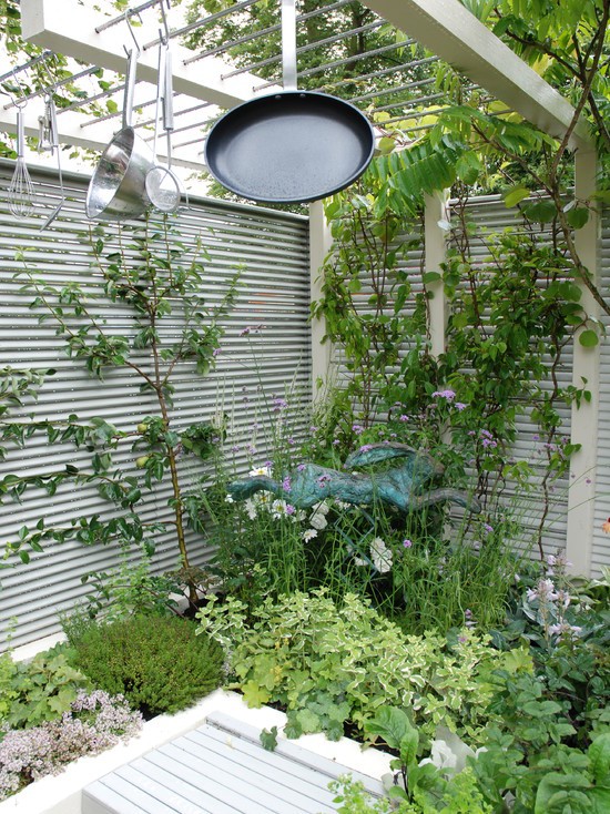 这个庭院满满的都是挤满了主人对烹饪的热爱,菜园架子上锅碗瓢盆极具创意。