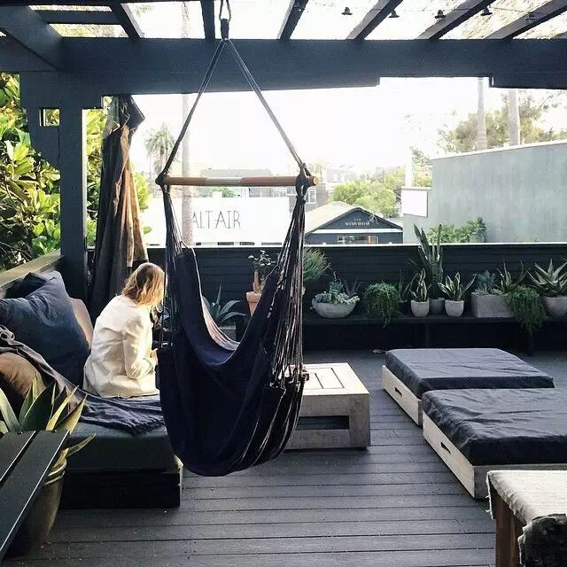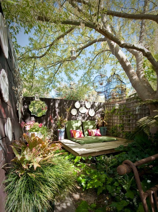 绿树成荫的空间下可以是一个很舒适的甲板休息区,贴在墙面的镜子和盘片很吸引人,悬挂在树枝上鸟笼和灯笼营造一种异想天开的禅意休息区。