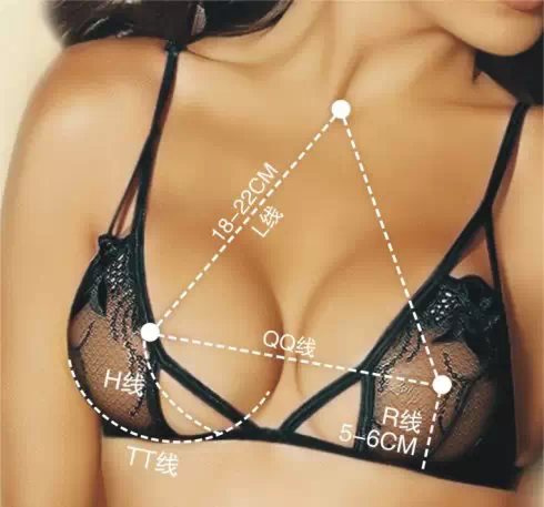 完美的胸部会吸引男性的瞩目,而最完美的乳房曲线,由〔正面〕看来是呈现出“等边三角形”,也就是俗称的“黄金三角点”,这三点分别为锁骨中间凹陷处以及两个乳头,这三点所连接成的直线如果是等距离的正三角形,那就符合“黄金三角点”的完美比例。