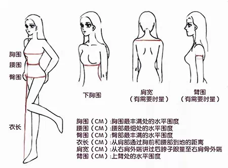 02胸围:由腋下沿胸部的上方最丰满处测量胸围,应为身高的一半。