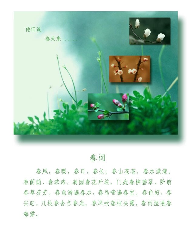 [ft=#009900,3,楷体_gb2312]三月三,一片艳阳天。呼朋引伴小河边,江绿水暖鸭儿欢,牧童仰面看纸鸢。[/ft]