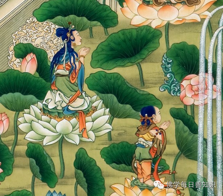 在琉璃宝地的正前方,也就是画幅的下方部分,画的是一大莲池海会图,有七重栏楯、七重罗网、光现花幢、光现宝幢,和分十四支出水的摩尼宝珠,宝珠的光中出现化鸟。大莲池所表现的主题是九品往生,最前一排,面向西方三圣像,作背后观的行者是闻法受记、上品上生、花开见佛等等。