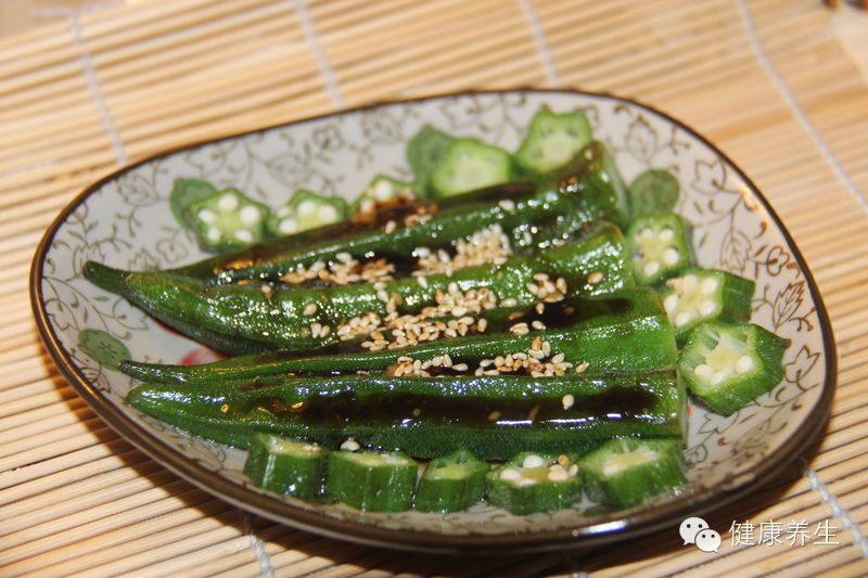 1) 将秋葵洗干净,放入沸水中烫熟,捞出;
