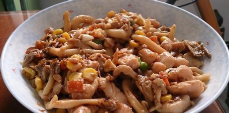 鸡脯肉切丁,蘑菇洗净切好,可以切点辣椒。爆炒几分钟就好了~很好吃哦~