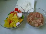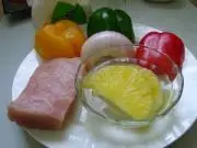 3 淀粉和面粉混合,彩椒切块,洋葱切块。肉用盐,胡椒粉,姜汁,蛋清腌渍半小时。