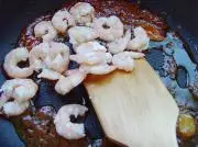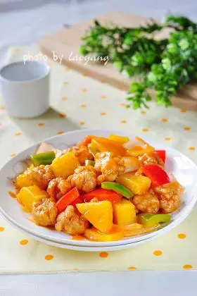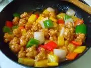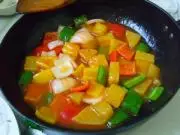 8 放入一汤匙番茄酱,一茶匙糖,炒匀。放半碗煮菠萝的糖水,一茶匙盐,调成合口的酸甜汁,至汤汁粘稠。