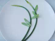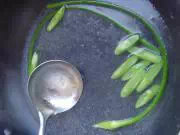 4 豆角、蒜薹下入加少许盐的沸水锅中汆烫,勾薄芡使之颜色亮丽。