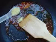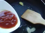 7 锅置火上油烧热,下姜片煸出香味后,放入番茄沙司,炒出红油。
