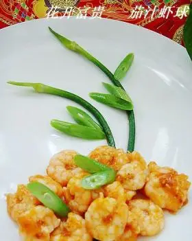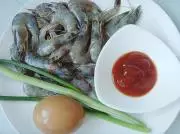 1 材料:鲜虾、蛋清造型:蒜薹、豆角调味:盐、鸡精、料酒、胡椒粉、糖、番茄沙司。