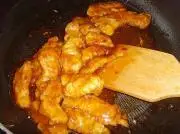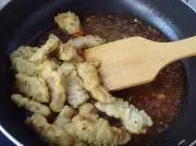 9 烹入糖醋味汁,倒入里脊条翻炒均匀。