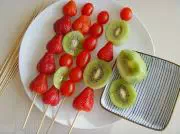 3 将处理好的草莓、番茄、猕猴桃用竹签串起。