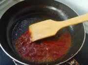 8 锅留底油烧热,倒入番茄酱煸炒出红油。
