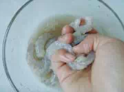 2 虾去壳、虾线,用盐和料酒反复抓洗几次。