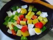 7 锅里放三分之一汤匙食用油,炒一下彩椒和洋葱片,炒均匀。