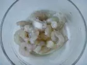 3 用厨房用纸吸净虾上的水份,加入盐、料酒、胡椒粉、蛋清腌制二十分钟。