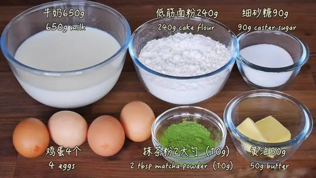 抹茶可丽饼:低筋面粉240g,鸡蛋4个,牛奶650g,黄油50g,抹茶粉2大勺(10g),细砂糖90g,盐一小撮,植物油适量