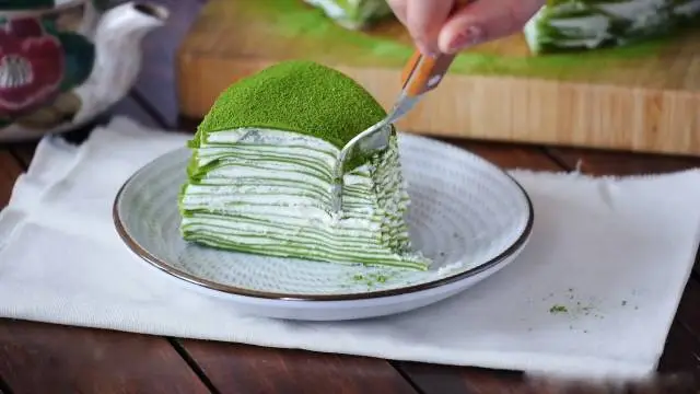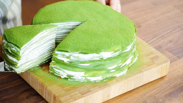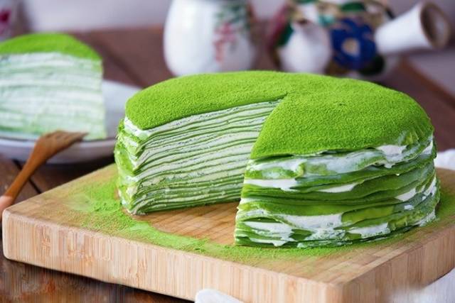 做一些简单的煎饼,加一点抹茶粉在面糊里,再稍加用心,把饼皮煎得薄而柔软,然后层层叠叠地夹上新鲜现打的鲜奶油,就是清新可人的抹茶千层蛋糕。