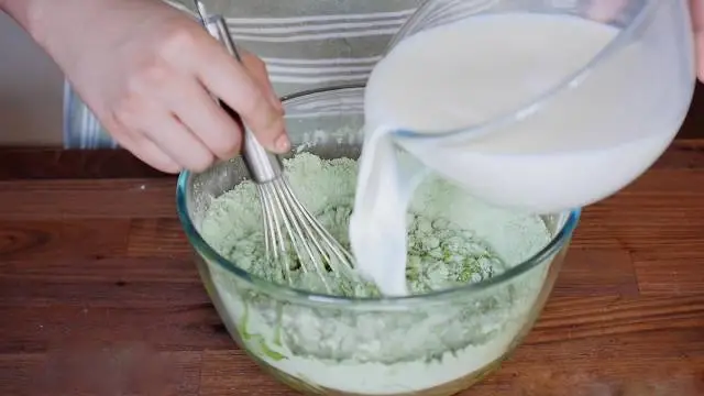 3. 一边搅拌一边分3次倒入牛奶拌匀