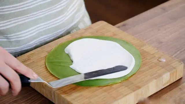 12. 取一张饼,铺上打发奶油,用刮刀抹平,再叠上下一张,依次进行直至完成千层蛋糕