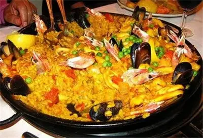 鸡腿3只、海虾100g、鲜贻贝300g、北极虾200g、香肠50g、甜椒240g、洋葱150g、大米300g、橄榄油、盐、黑胡椒、姜1块、白葡萄酒、姜黄