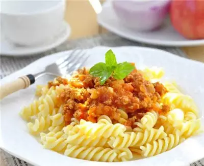 猪肉末300g、番茄1个、意大利面500g、洋葱半个、蒜1头、番茄酱2汤匙、盐1.5茶匙、白砂糖半汤匙、黄油20g