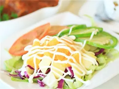 搭配上各种蔬菜,再加些虾仁,挤上多多的香甜沙拉酱.......