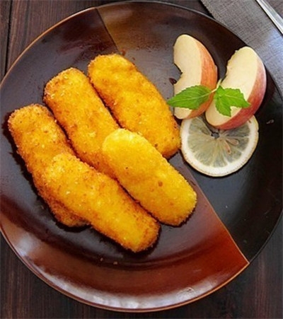 8.取适量土豆泥搓圆然后整成圆柱体,先裹一层薄面粉,然后浸好蛋液,再全部裹上均匀的面包糠;