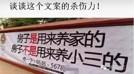 “房子是用来养家的,房子不是用来养小三的”,这个文案是去年做的,当时背景是三四线城市的房子很难卖。你楼盘所处的区域,离市中心的远近,配套等等决定了你房子的价格。如何在相同情况下,让客户选择你的房子?主观意愿就很重要,情感营销就是突破口。这个文案出来前,买楼的人群性别比例是五五开,这个文案出来后,变成八成都是女性来付款,这就是效果。