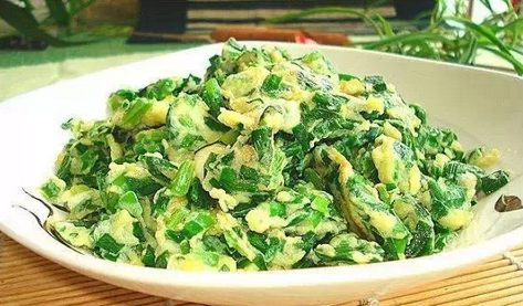 ②韭菜炒鸡蛋:新鲜韭菜100克,洗净切碎,鸡蛋3只(去壳),同切碎之韭菜捣匀,用素油、食盐同炒至熟佐食。功能:温中养血、温肾暖腰膝。
