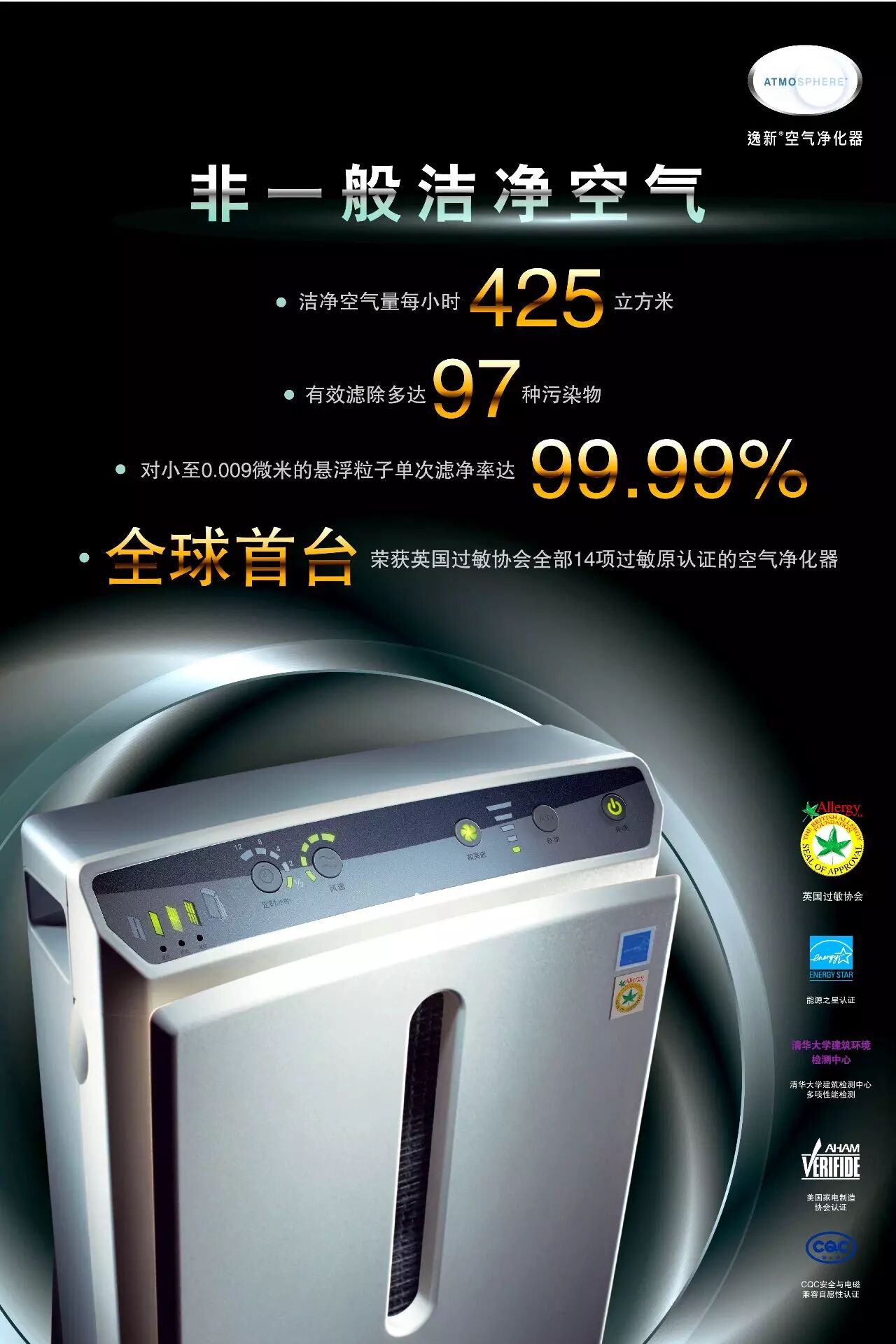 权威认证:荣获英国过敏协会、AHAM品质认证,多项污染物的净化效能经清华大学建筑环境检测中心性能检测评定达到《空气净化器国家标准》规定的最高级别A级。