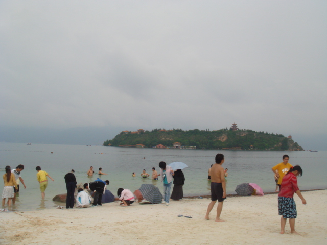 烧烤野餐快结束的时候又下起了雨,游泳只好放弃,大家打着伞在抚仙湖漫步,呼吸着湖边的清新空气,湖水的温度很温和,湖中依然有游泳的人,因为不会游泳,体会不到在雨中游泳的乐趣,只能在一旁羡慕着。
