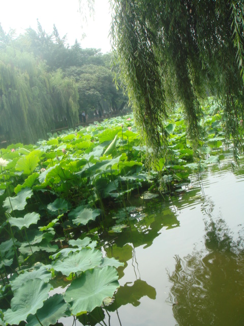 夏季湖内荷花、莲花争相绽放,柳枝随风拂面,湖边或歌或舞或拉或拍或坐或行的人都沉缅于自己的悠然自得之中。