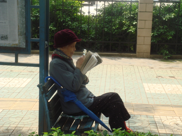 这张是在翠湖外的一个报栏下拍的。老太太专注的神情吸引了我。这位老太太看上去有80岁以上吧,她穿戴整齐,非常简朴,但也非常讲究。座位下垫了一块象塑料袋的东西,看得出老太太很爱干净。椅子边靠着一把雨伞,7月正是雨季,昆明的雨说下就下,毫无征兆的,说明老太太是个心细的人。从穿着上看,老太太很注意保暖,昆明早晚温差大,气温要低一些,这也说明老太太是非常懂得自我爱护的人。她选了一个非常好的位置看书,阳光透过树叶为老太太提供了明亮但柔和的光线,在树阴下,这一块角落全然已属于她一个人的世界,她旁若无人地享受着这一时光。也许看书只是表面的一部分,也许此时她正回忆着她的过去,也许.....