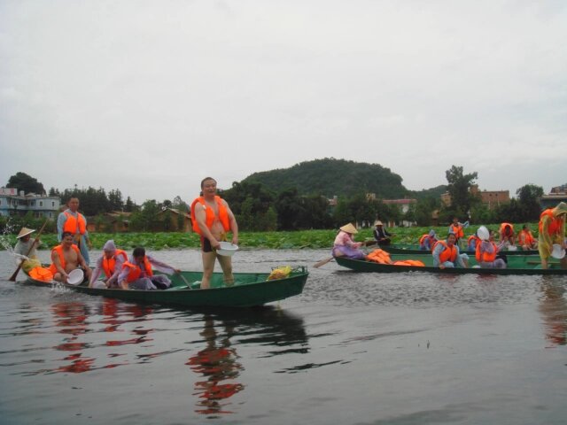 进入景区,就见有游客在买水盆、水桶、雨衣。原来到普者黑游玩除了看风景,打“水仗”是游客自发保留的一道“景致”。来之前就有所了解,船上如有老年人一般不会遭到“攻击”,为了摆明我们都是“手无寸铁”的老弱人士,避免挨“打”,这些防御工具也就不需要了。