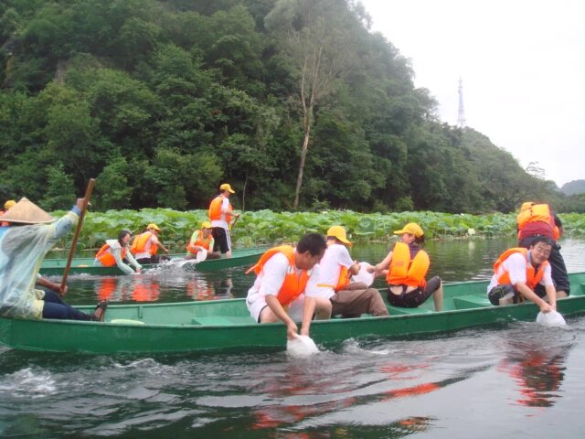 景区的管理人员给我们一家人安排了一位阿黑哥来撑船。我们刚上船,其他的船夫就起哄那位阿黑哥唱山歌。原来,我们的船老大是有名的山歌王,这下我们就有耳福了。