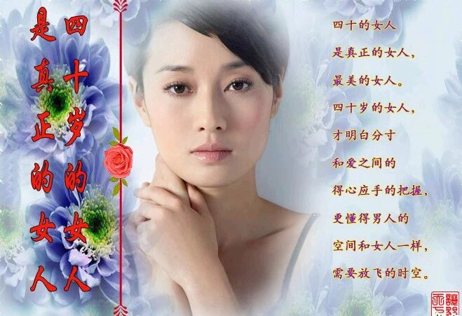俗话说:“三十而立,四十不惑。”女人也是一样,女人四十一枝花。一个女人到四十岁才感觉成熟,因为这时的她真正懂得了生活,懂得了家庭,懂得了社会,懂得了自己的人生价值。