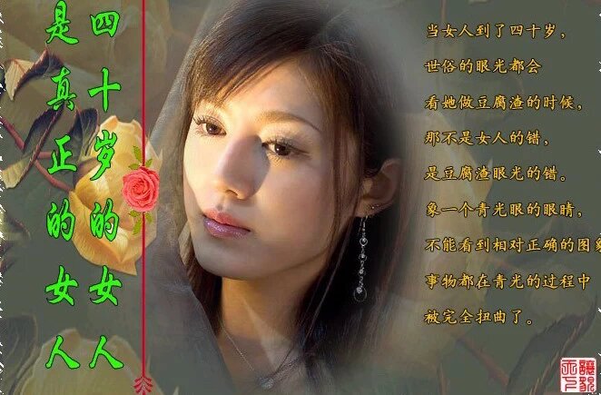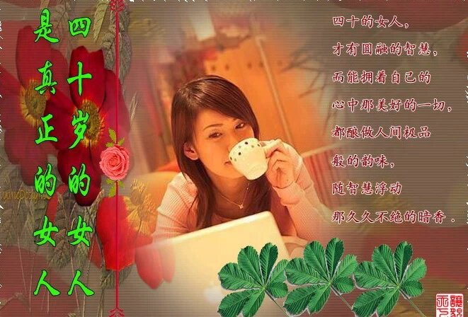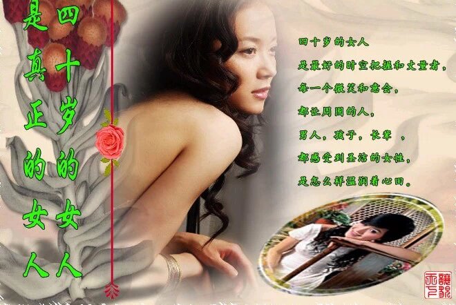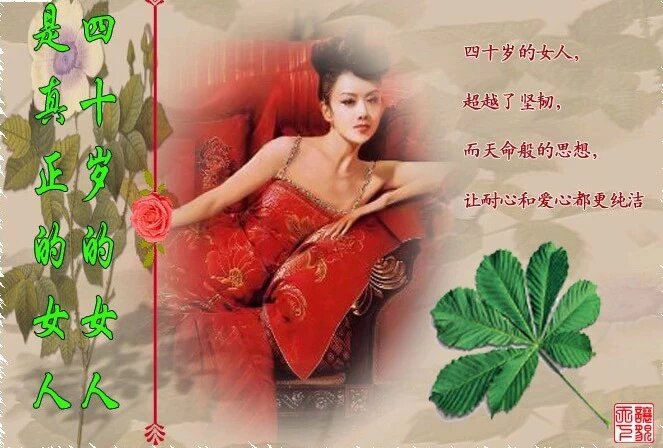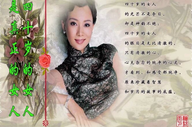 四十岁的女人更是气质深邃而雍容华贵,国色天香的美,在不惑的岁月中蕴藏,举止优雅,仪态丰韵,都在举止启唇中流泻无遗;从聪明伶俐的日子走过,到四十岁的圆润的智慧,把自己心中那美好的感受和历练,都酿做人间极品般的韵味,随智慧浮动着那久久不绝的暗香。
